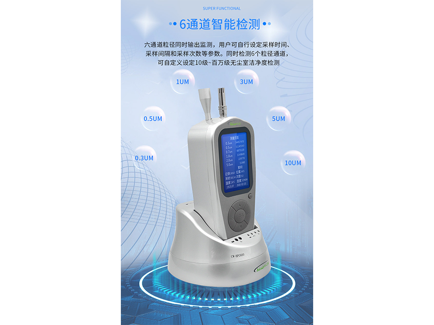 該粒子計(jì)數(shù)器按照國際標(biāo)準(zhǔn) ISO 和 GMP 設(shè)計(jì),能同時(shí)對(duì)六個(gè)粒徑檔(用戶可自行選擇待定粒徑)進(jìn)行檢測(cè),采樣時(shí)間長達(dá) 59 分 59 秒,多達(dá) 2000 組的采樣數(shù)據(jù)可存儲(chǔ)在內(nèi)置的閃存內(nèi),并可通過 USB 接口方便下載。具有測(cè)試精度高、性能穩(wěn)定、多功能性強(qiáng)、操作簡單方便的特點(diǎn)。